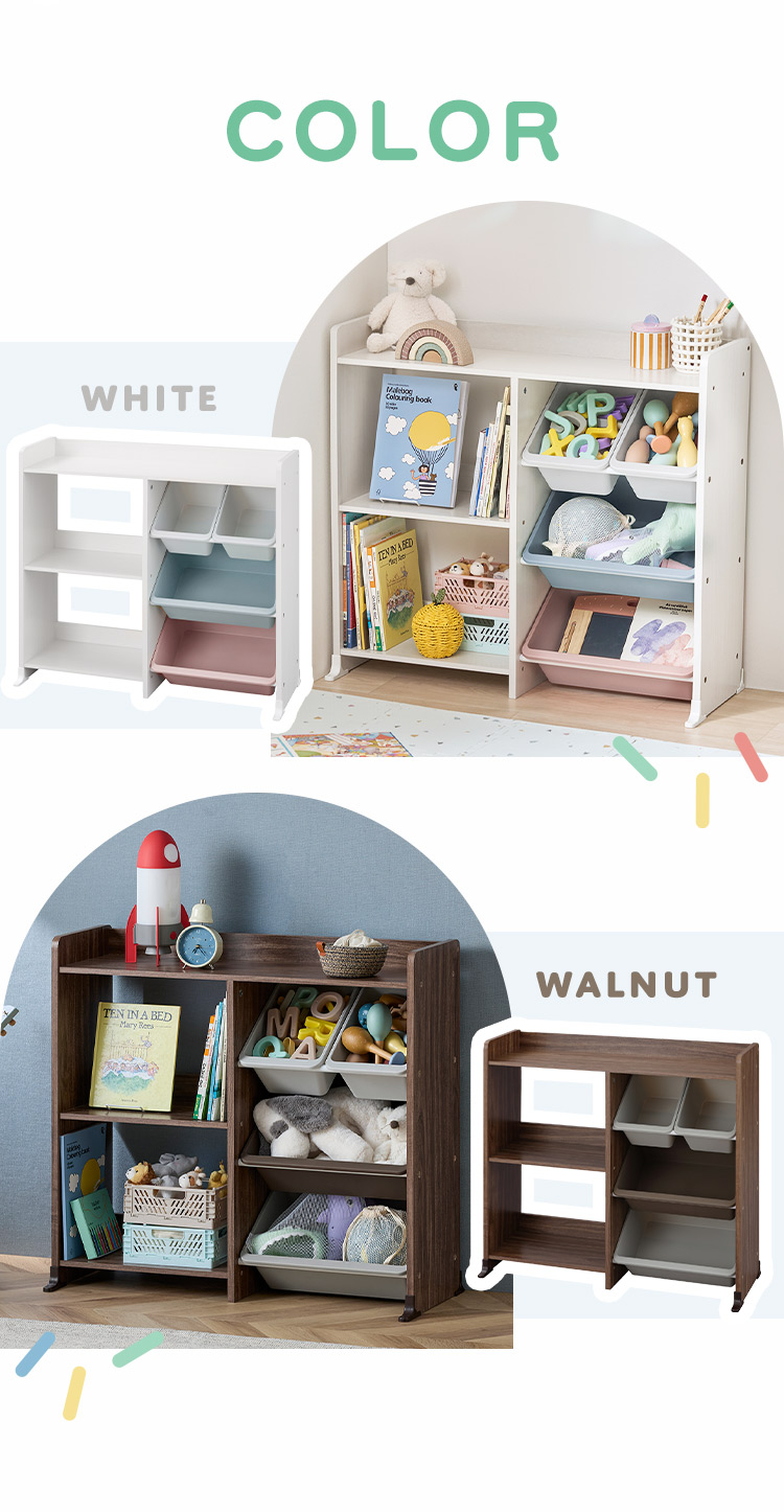色分けされていることで「どこに何を片付ける」のルールが決めやすく、お子様の自立心をサポートし楽しくお片付けができる収納用品です。