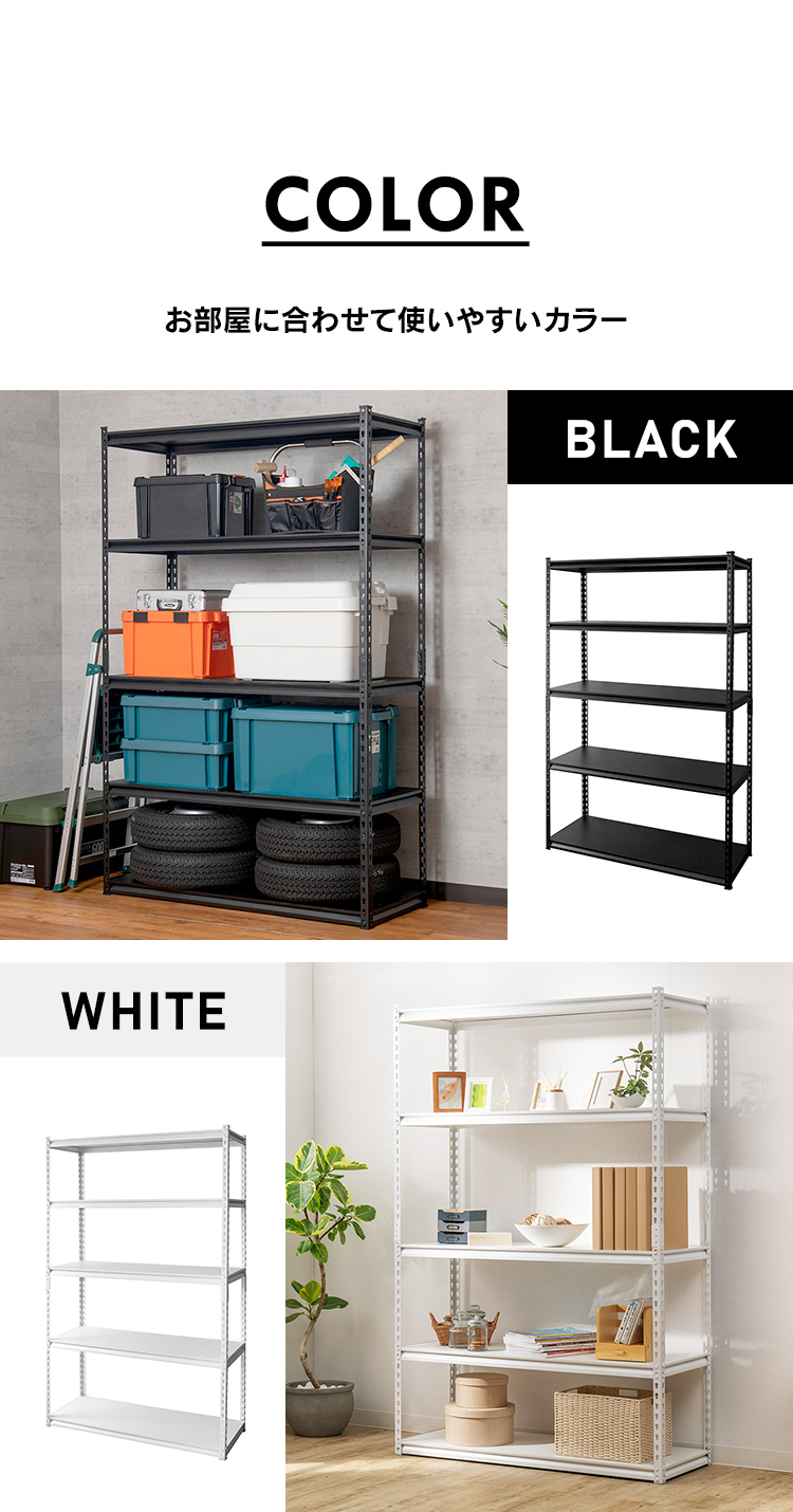 お好みの位置に設置できる5枚の可動棚が付いたスチールラック。