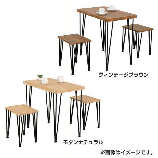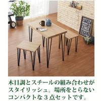 木目調のデザインの天板とマットブラックのスチールの組み合わせのコンパクトダイニング3点セットです。