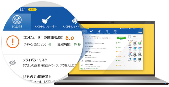 1クリックでパソコン上の問題点を診断し、健康状態を 10点満点で表示します。
