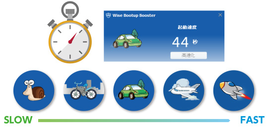 パソコンの起動時間を計測・表示。カタツムリ〜ロケットへと、画像でわかりやすく表示します。