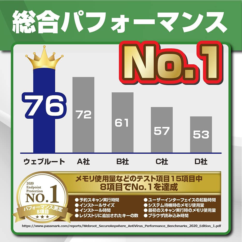 パフォーマンス比較ウェブルートのエンドポイントセキュリティは、クラウド型システムを採用していることにより、PCにかける負担も軽微です。第三者評価期間の「Passmark社」が実施しているパフォーマンステストの結果です。2014年から総合評価において1位と取り続けています。