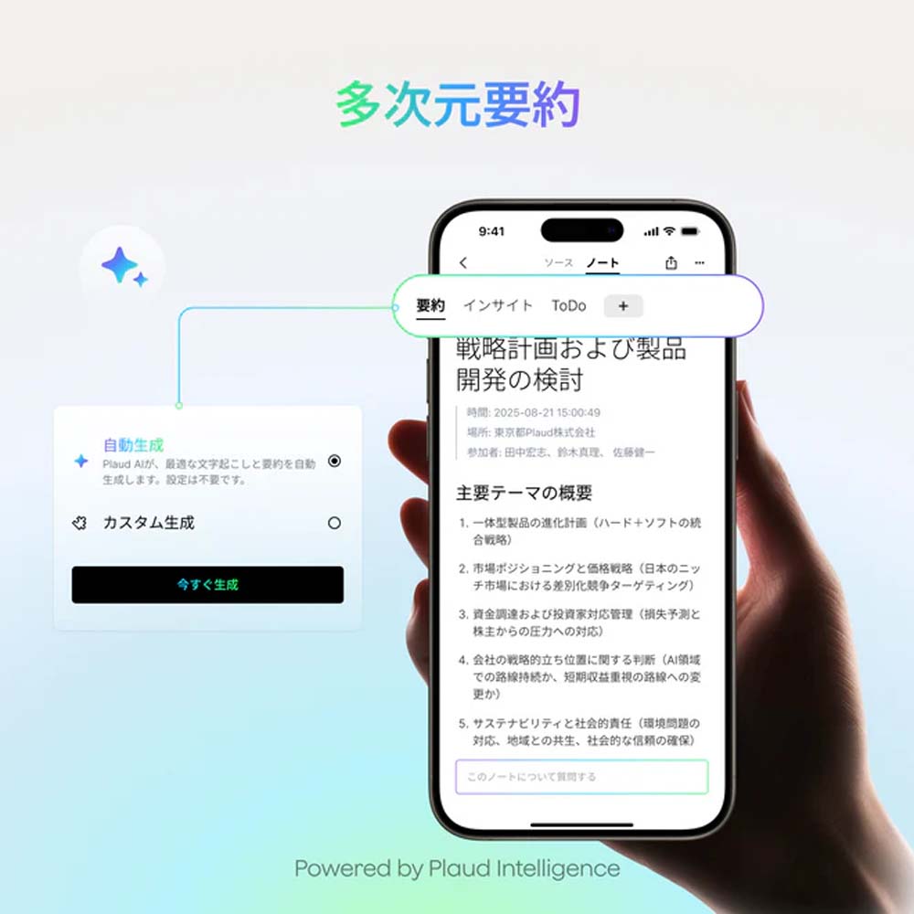 【Ask Plaud】Ask Plaudは、要約内容への質問、インサイトの抽出、メール作成、次のアクションを提案する対話型AI機能です。すべての回答は音声ソースに基づくため、信頼性が高く、そのままノートとして保存できます。