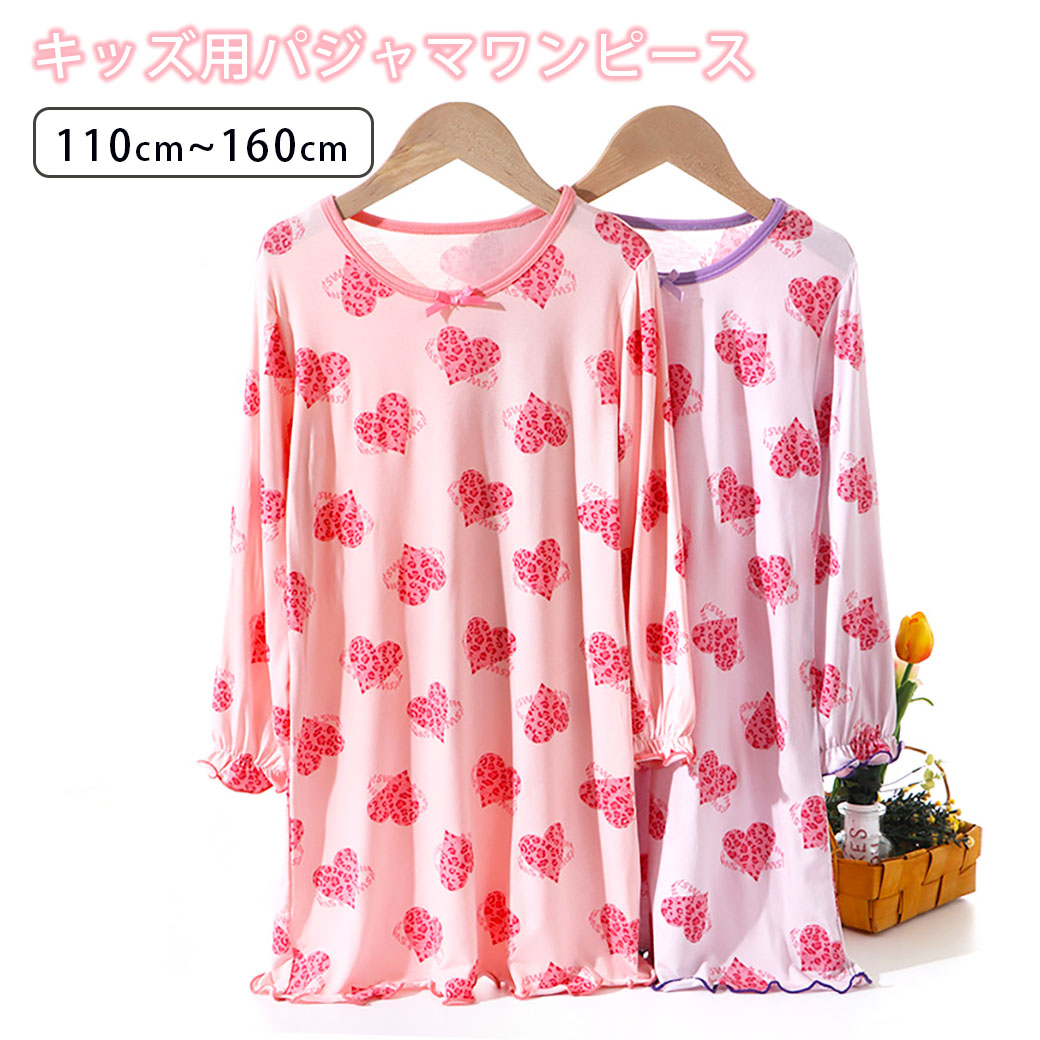 パジャマワンピース キッズ女の子用 薄手通気性 フリル付きハート・ヒョウ柄 ピンク・パープル 110-160cm オールシーズン