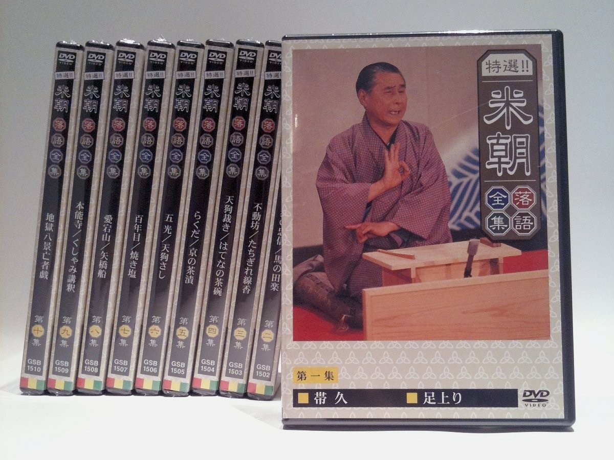 | 円熟の極致。上方話芸の至宝を集大成。堂々の完結! ! 必携保存盤! ! 崩壊寸前だった上方落語を見事なまでに復活させ、76才になった今も、およそ100日の舞台をつとめる人間国宝・桂米朝の特選19話を収録。 特製手ぬぐい付。(※手ぬぐいの色は各期によって変わります。) <仕様> 10DVD ■品番:TPD-6061 ■JAN:0 ■発売日:2002.10.717 ◎DVD10枚組 ◎カラー/ステレオ ◎「桂 米朝オリジナル手拭い(非売品)」付き! ※このディスクは、プレーヤーにセットすると自動的にメニュー画面が表示されます。 演目の解説文も画面より選択してお楽しみいただけます。 <収録内容> 第一集 ・帯久(45:40)平成元年4月17日/大阪コスモ証券ホールにて収録 ・足上り(26:12)平成元年4月17日/大阪コスモ証券ホールにて収録 第二集 ・猫の忠信(37:42)平成元年5月9日/大阪コスモ証券ホールにて収録 ・馬の田楽(24:34)平成元年3月7日/大阪コスモ証券ホールにて収録 第三集 ・不動坊(33:11)平成元年5月9日/大阪コスモ証券ホールにて収録 ・たちぎれ線香(39:09)平成元年5月9日/大阪コスモ証券ホールにて収録 第四集 ・天狗裁き(25:22)平成元年6月13日/大阪コスモ証券ホールにて収録 ・はてなの茶碗(26:00)平成元年9月12日/大阪コスモ証券ホールにて収録 第五集 ・らくだ(42:06)平成元年10月17日/大阪コスモ証券ホールにて収録 ・京の茶漬(18:17)平成元年11月21日/大阪コスモ証券ホールにて収録 第六集 ・五光(21:53)平成元年4月17日/大阪コスモ証券ホールにて収録 ・天狗さし(16:35)平成元年9月12日/大阪コスモ証券ホールにて収録 第七集 ・百年目(41:58)平成元年11月21日/大阪コスモ証券ホールにて収録 ・焼き塩(16:04)平成元年10月17日/大阪コスモ証券ホールにて収録 第八集 ・愛宕山(32:51)平成2年2月20日/大阪コスモ証券ホールにて収録 ・矢橋船(24:38)平成2年3月20日/大阪コスモ証券ホールにて収録 第九集 ・本能寺(30:49)平成2年1月23日/大阪コスモ証券ホールにて収録 ・くしゃみ講釈(28:13)平成2年1月23日/大阪コスモ証券ホールにて収録 第十集 ・地獄八景亡者戯(68:08)平成2年4月22日/京都府立文化芸術会館にて収録