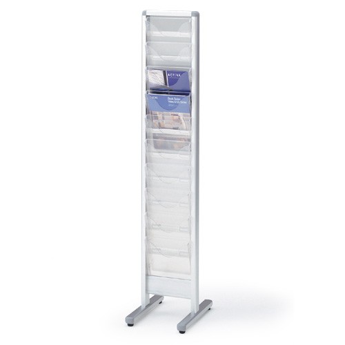 自立タイプのパンフレットスタンド。取り外し可能なカセット式で、配置がえがしやすいのがポイントです。脚部はアジャスター付ですので、床面に若干のがたつきがあっても安定した状態でご利用いただけます。