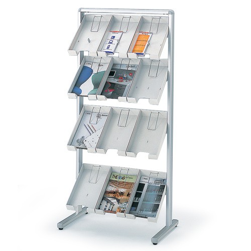 自立タイプのパンフレットスタンド。取り外し可能なカセット式で、配置がえがしやすいのがポイントです。トレイタイプなら付属の仕切りを取付けることで、A4・3つ折りサイズも収まります。脚部は、床面に若干のがたつきがあっても安定した状態でご利用いただけるアジャスター付です。