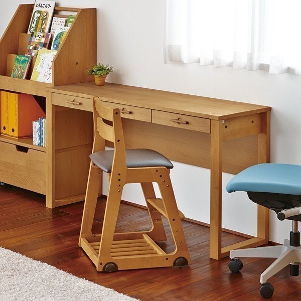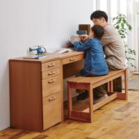 リビング学習を考慮した、浅い奥行きで置きやすいサイズのデスク。兄弟・親子で並んで一緒に、コミュニケーションをとりながら学べます。天板下には引き出し3杯付きで、文具やプリントなどの収納スペースもしっかり確保できます。