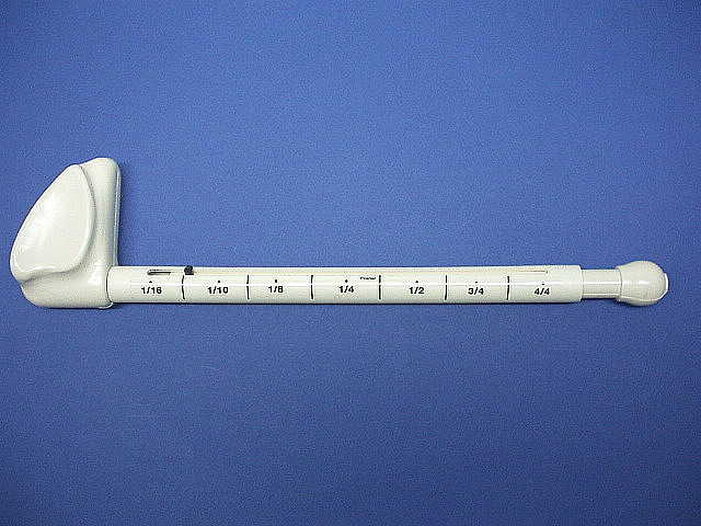 バイオリン教室必帯分数バイオリンサイズ測定器 特許新製品 Vio Meter 数秒で的確に生徒さんのバイオリンサイズが測定できます。*使用法* 左端にあるあご当てを実物のバイオリンと同じようにあて、左手の真ん中でボールを上向きに包み右端のこみます。スライド式の 先端を手が伸びるだけ延ばします。黒いマーカーの示しているサイズが、その生徒さんに一番適したサイズになります。