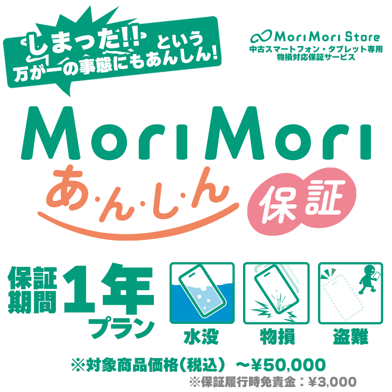 Mori Moriあんしん保証 とは、通常の自然故障の保証に加えて物損、水没、盗難に対する保証を追加できる別途有料サービスです。