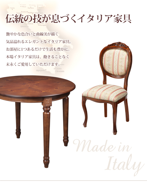 商品について:イタリア伝統の美しい象嵌細工が施された直輸入のダイニングテーブルセットです。艶やかな色合いと滑らかな曲線を描くフォルムがお部屋をエレガントに演出。チェアはフレームに施された彫刻と美しい猫脚が魅力的です。