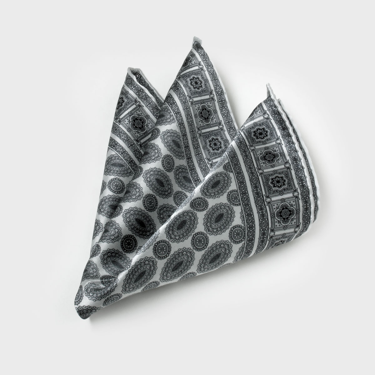 ポケットチーフは、折り方によっていくつかの柄が見えるようになっていて、さりげなく個性を引き立ててくれます。