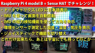 Sense HAT公式ライブラリは、ドットマトリクスLEDに日本語を表示できませんが、弊店が提供するサンプルプログラムを利用すれば、漢字を含め日本語も表示できます。IMUを使って表示の向きを自動制御する実例つき。弊店製説明書の内容についてはメールでサポートいたします。