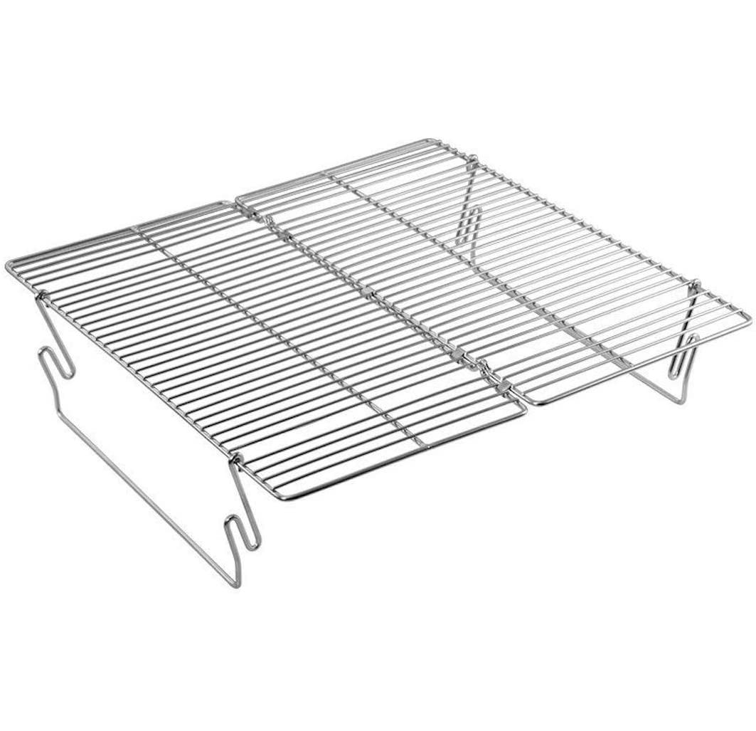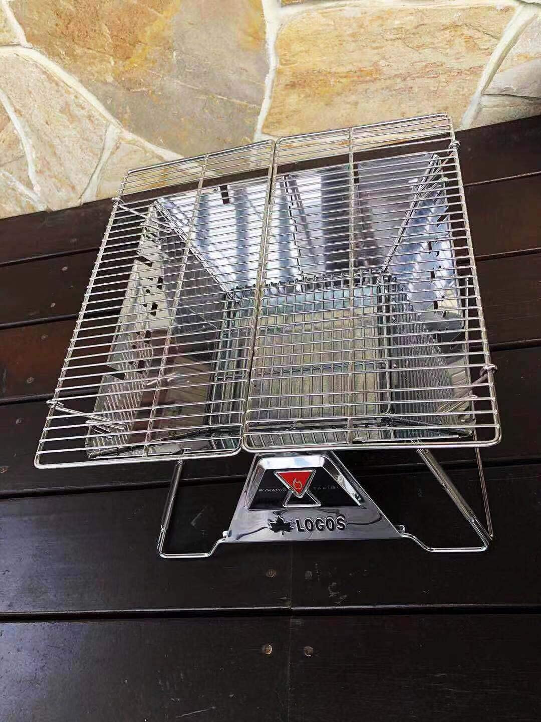 耐重量および耐久性を実現する為、蝶番の溶接点を大きくしているので、未使用の焼き網を焚き火台に載せると、多少斜めになります(工作不良ではありません、耐重量および耐久性以外も油が落ちてでモクモクと煙が出ることも防いてくれる利点も挙げられます)。