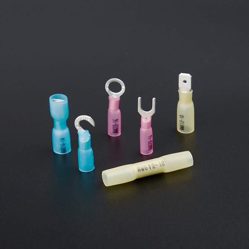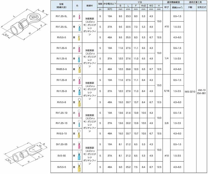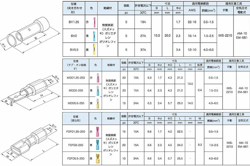 仕様:1.防水型ビニル絶縁付丸形端子、2.防水型ビニル・ナイロン絶縁付突き合わせ形接続子、3.防水型絶縁付差し込み型接続子、4.絶縁付タブ・オン接続子