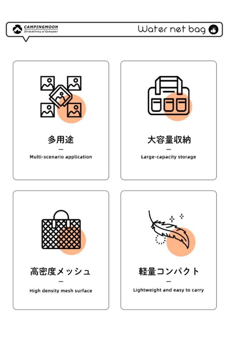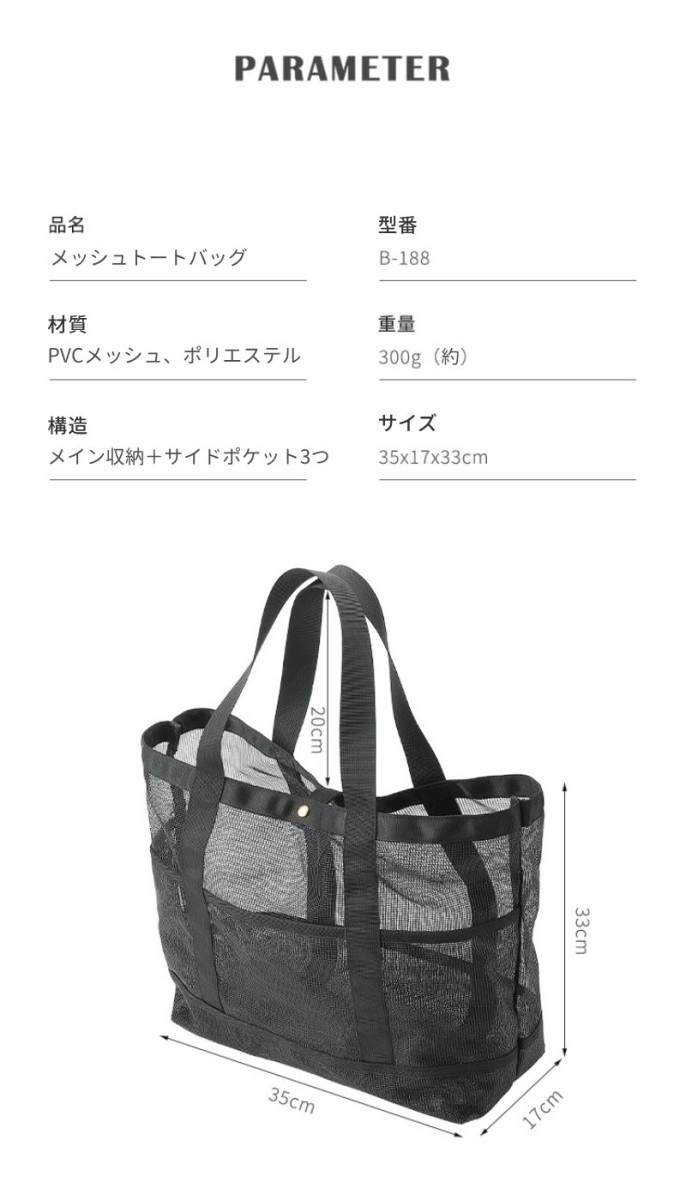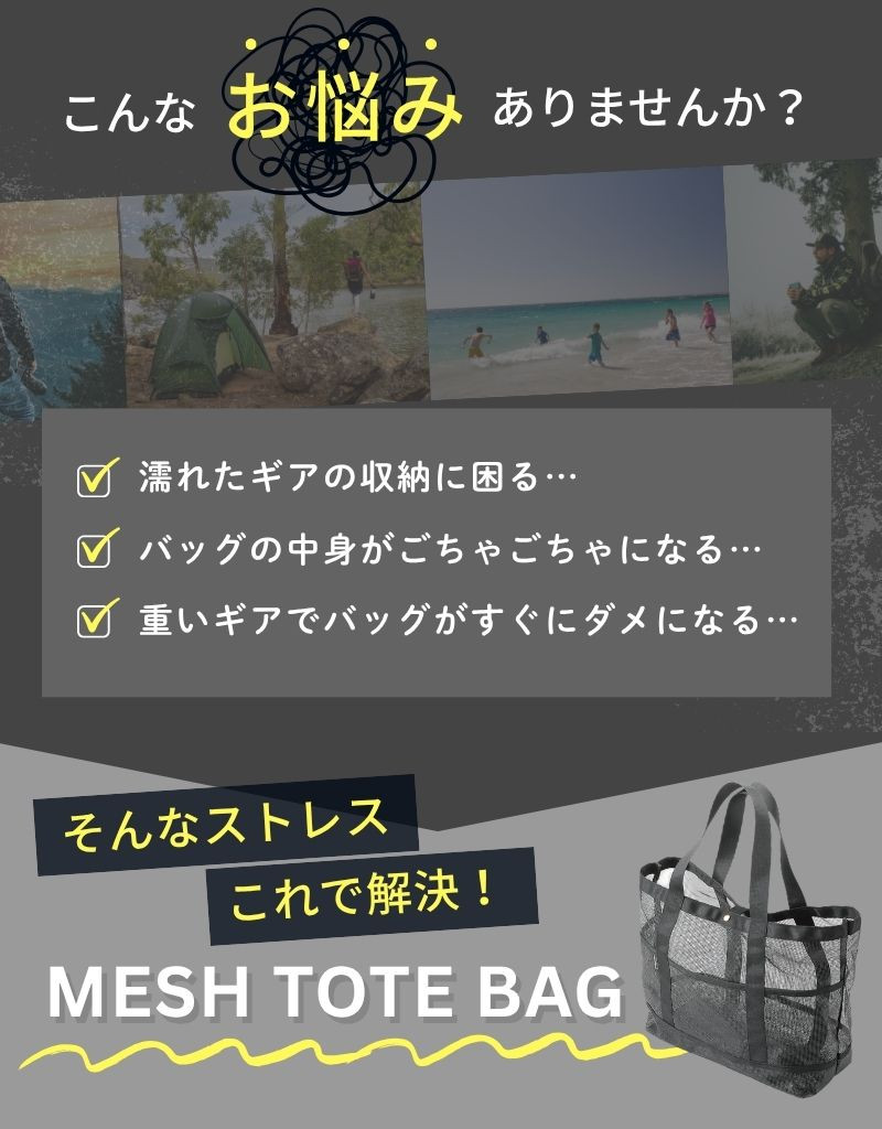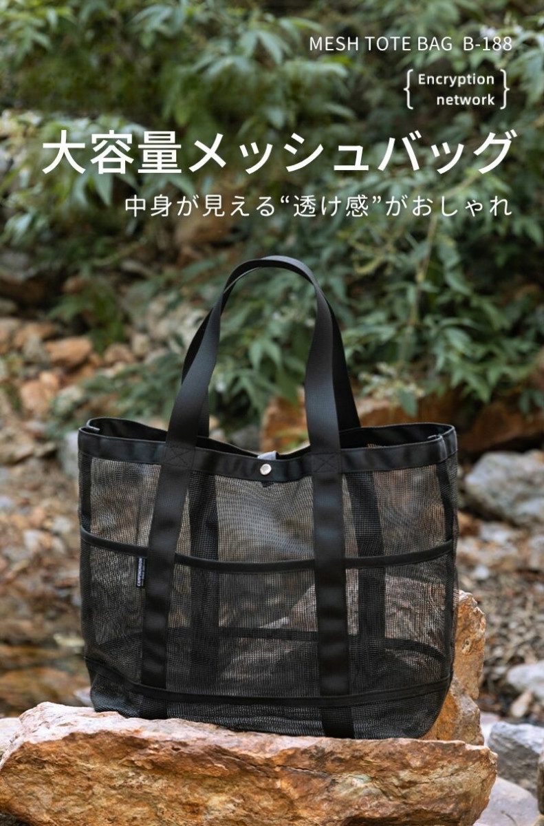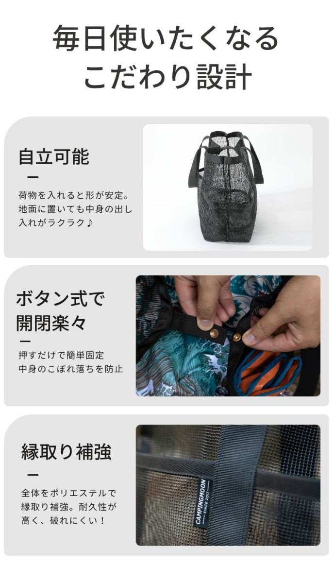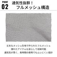 デザイン性 ・中身が透けるオシャレなメッシュ生地 ・通気性抜群で濡れ物や重量物も収納可能 |