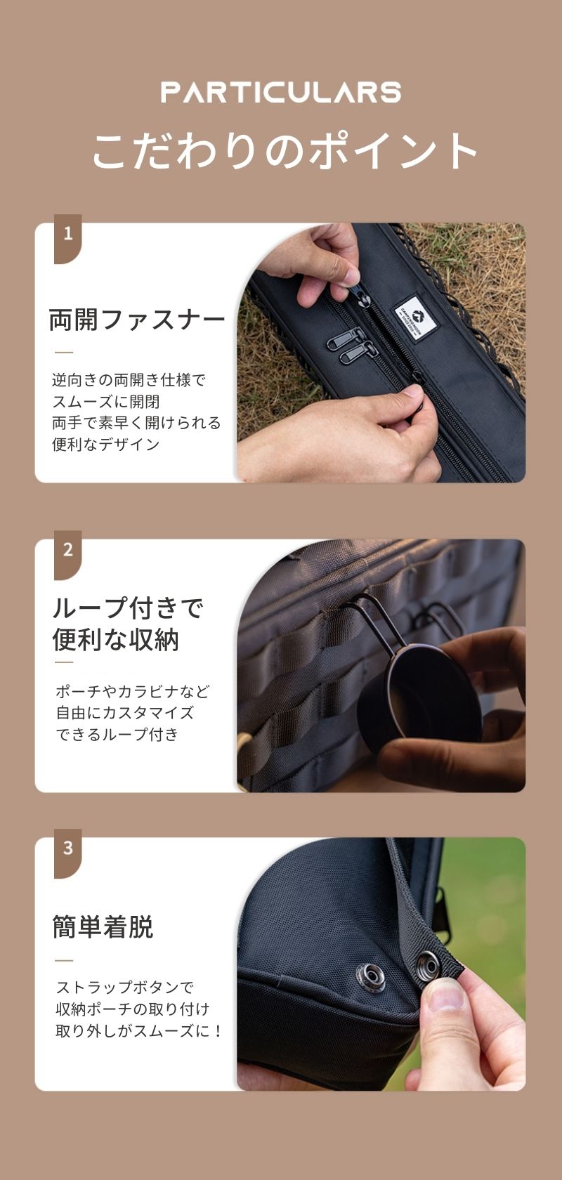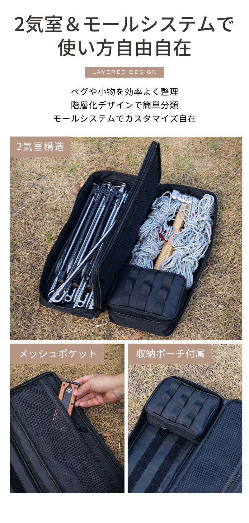 ジッパーをパカーンと開くと、仕切りメッシュポケットが現れます。ペグを取り出しやすいようにファスナーをパカーンと開けることができます。 前面に軍用MOLLEシステム。カラビナを通せるので、多彩な使い方ができるので 使い方自由自在。