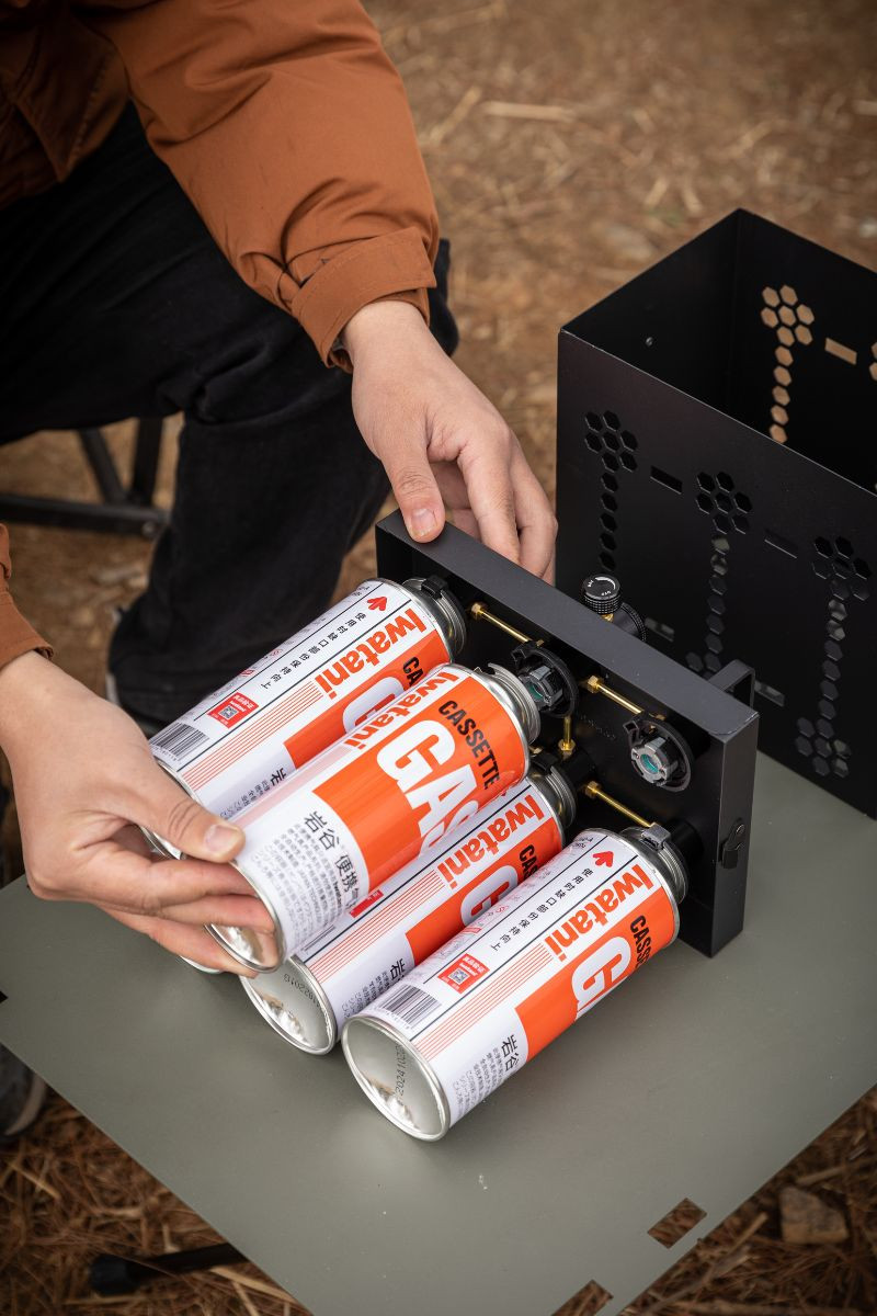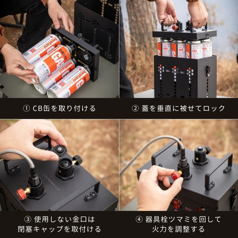 用途 カセットガス (CB)6本 を接続し同時に供給することができるガスステーション