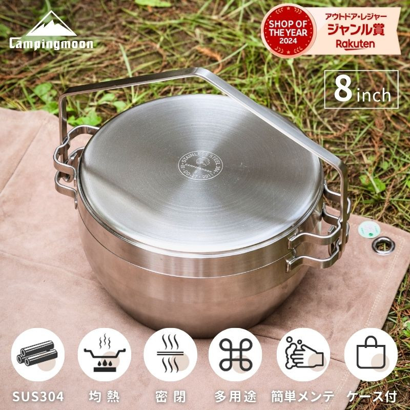 | 製品特徴 | ■鉄製は手間がかかる 安価なアルミ合金やステンレス430を使用しない、オールステンレス304製のダッチオーブンです。上に炭を載せられる頑丈で重いフタが特徴の、アウトドアではおなじみの調理器具です。 高い蓄熱性と上火を活かしたオーブン調理をはじめ、「煮る」「焼く」「炒める」「蒸す」「揚げる」など、一台で様々な調理を楽しめます。ダッチオーブンといえば鋳鉄製が主流で、最近ではホームセンターや100均でも見かけるほど身近な存在になっています。 黒光りするまで使い込んだダッチオーブンには確かに憧れますが、その域に達するまでには時間と手間がかかるのも事実。 お手入れをしないと錆びてしまう心配があり、重量も重く扱いづらい面があることから、上級者向けのアイテムというイメージがあります。
