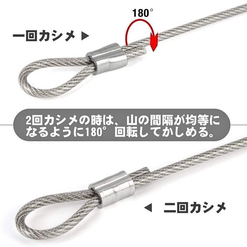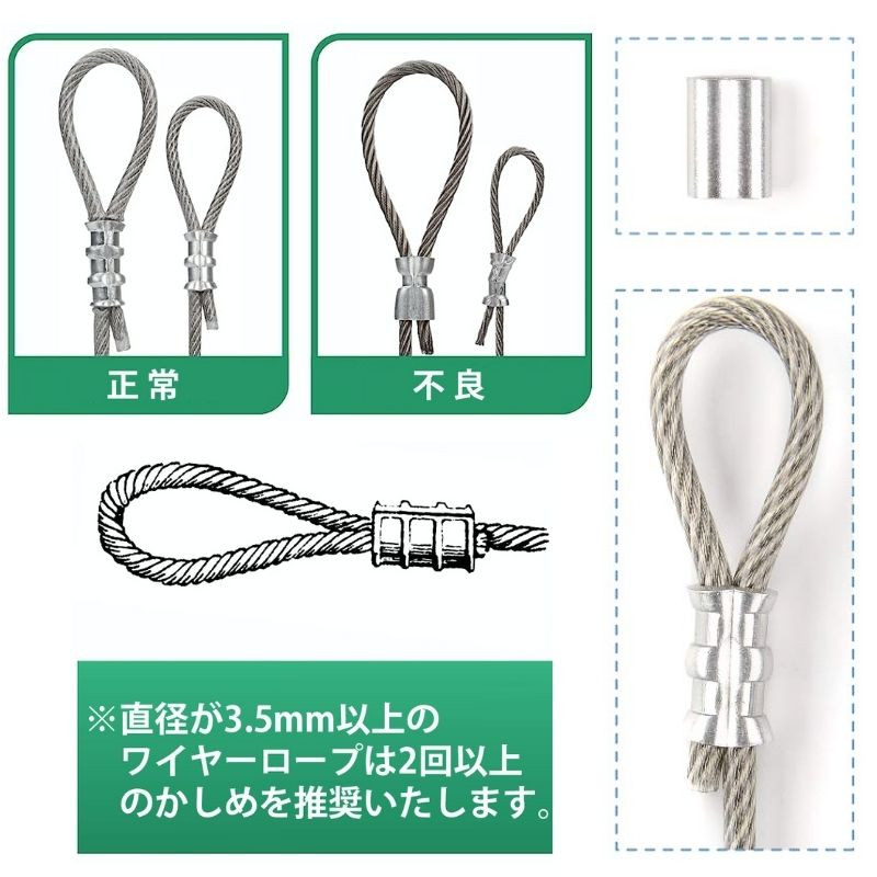 直径が2.5mm以上のワイヤーロープは2回以上のかしめを推奨します。