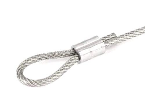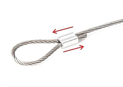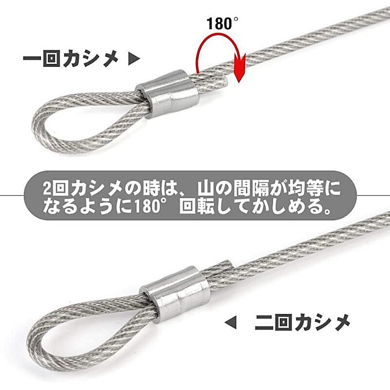 ・被覆ワイヤーロープは被覆を取り去ってから圧着して下さい。被覆の上から圧着すると荷重に耐えられず抜けてしまいます。
