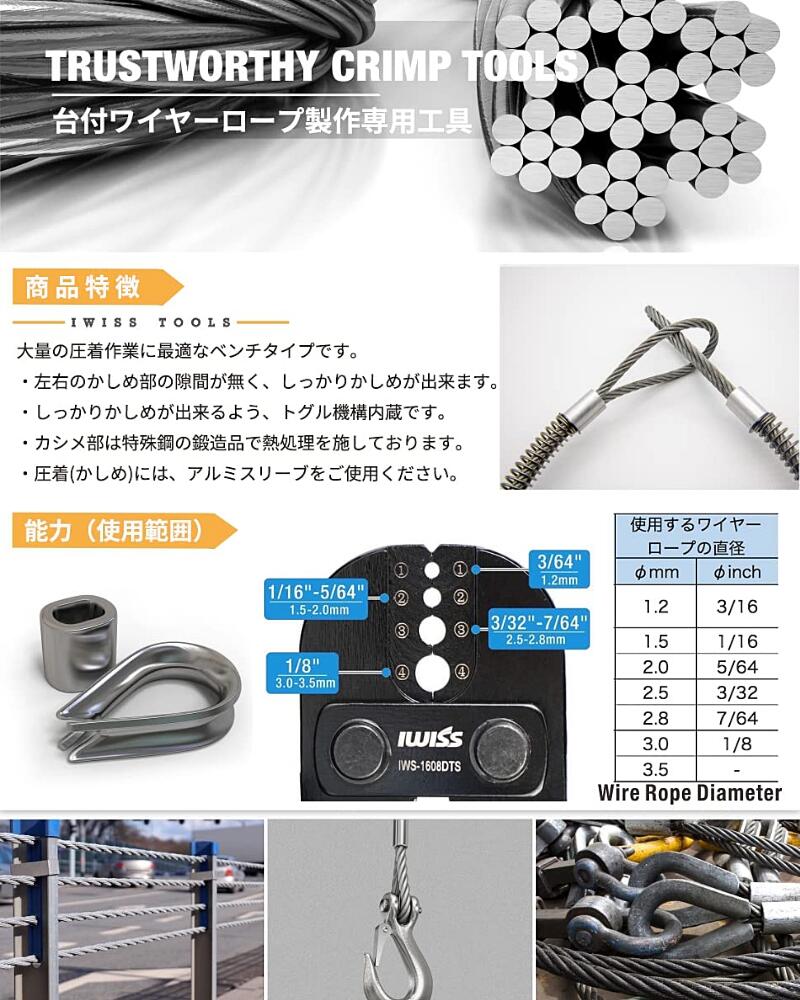 製品概要 直径φ1.2mm〜φ3.5mmのワイヤーロープ用圧着工具