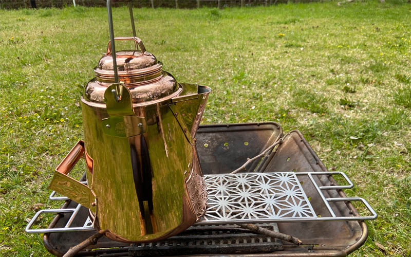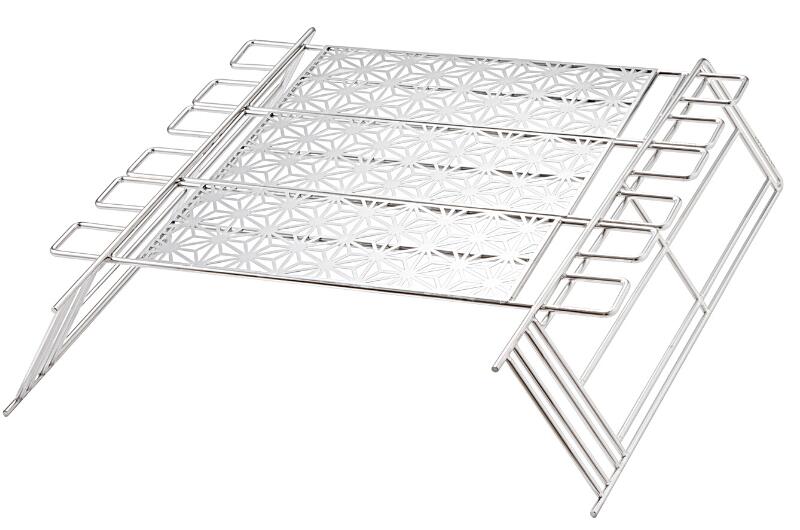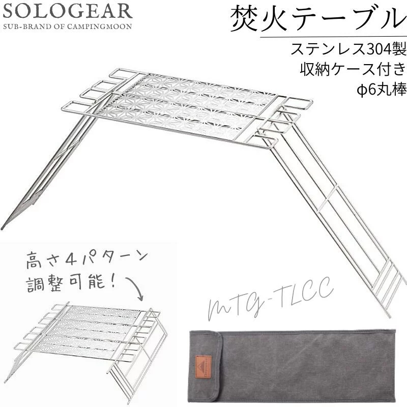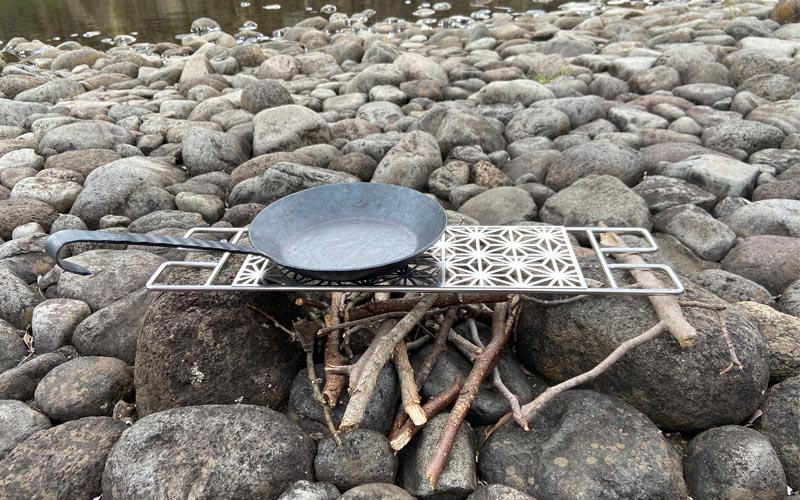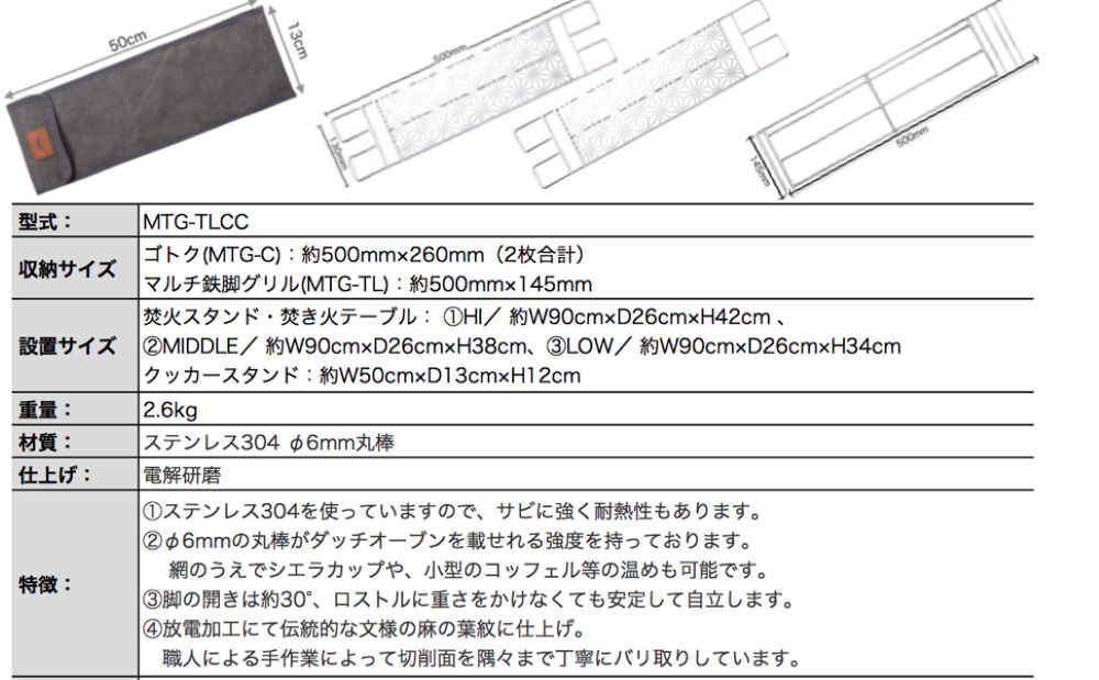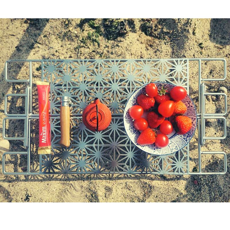 高さ2段式の鉄脚や麻の葉紋に仕上げの天板が付いており、キャンプの焚火の時だけでなくちょっとしたピクニックや登山の時のテーブルなどアイディア次第で幅広くご活用頂けます。