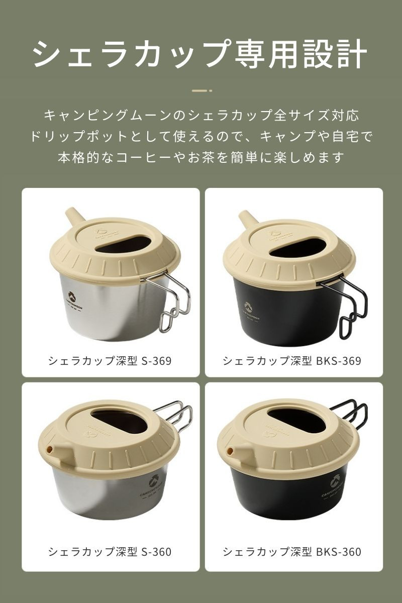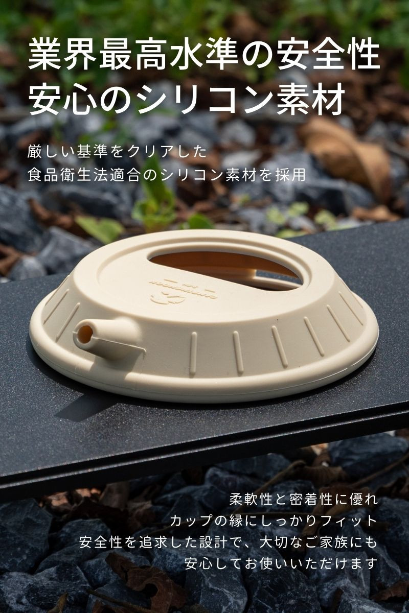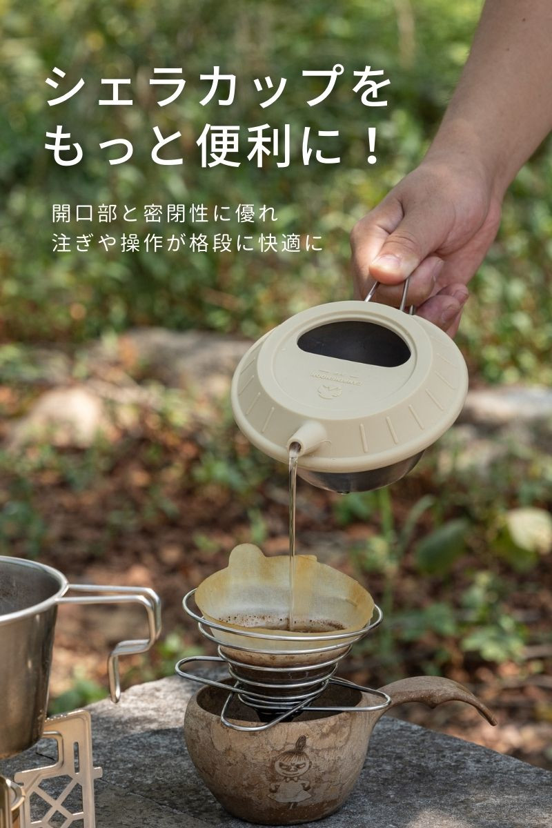 | 特徴 | シェラカップをケトルに変身させるユニークな蓋 【ホールドする構造】柔軟性と密着性に優れ、カップの縁にしっかりフィットして液体漏れを防ぎます。 【半月形の開口】便利な半円形の開口部を備えています。開口部を活用して水を加えたり茶葉を入れたりと、蓋を外さず手軽に操作が可能です。