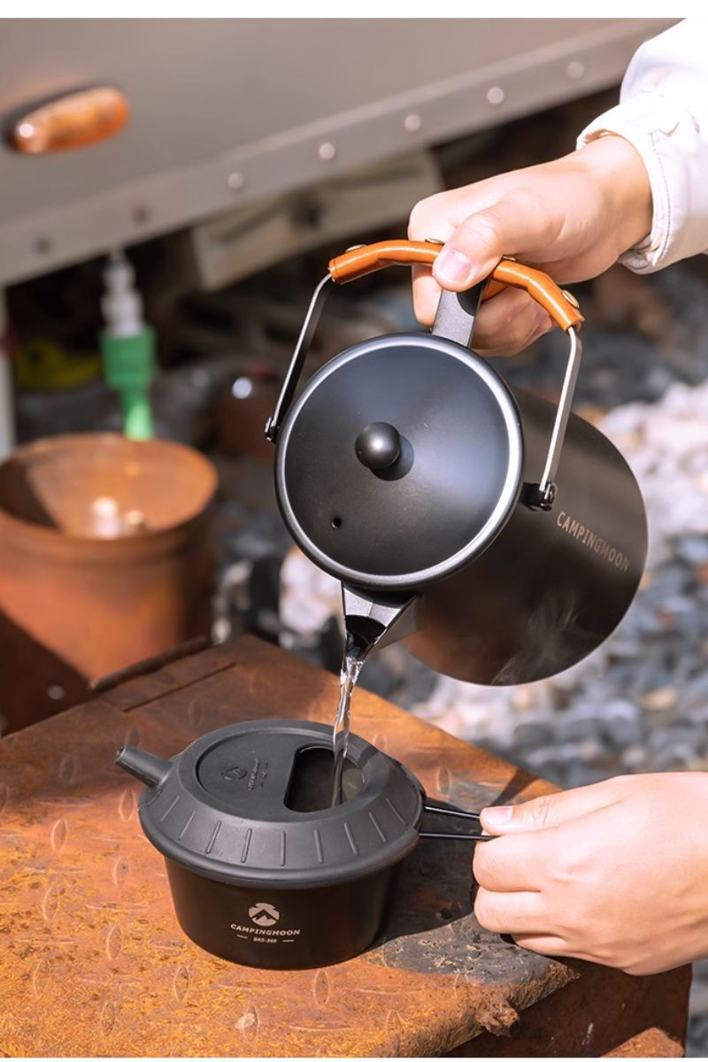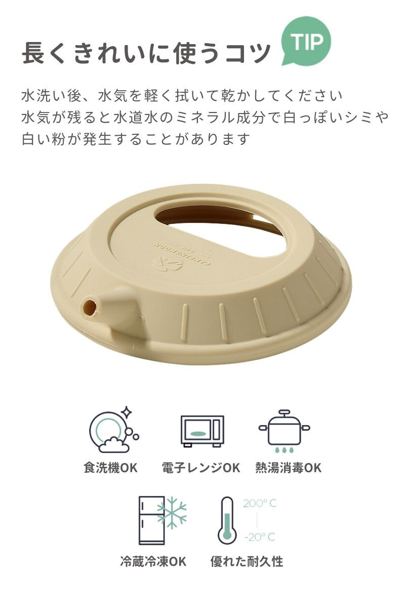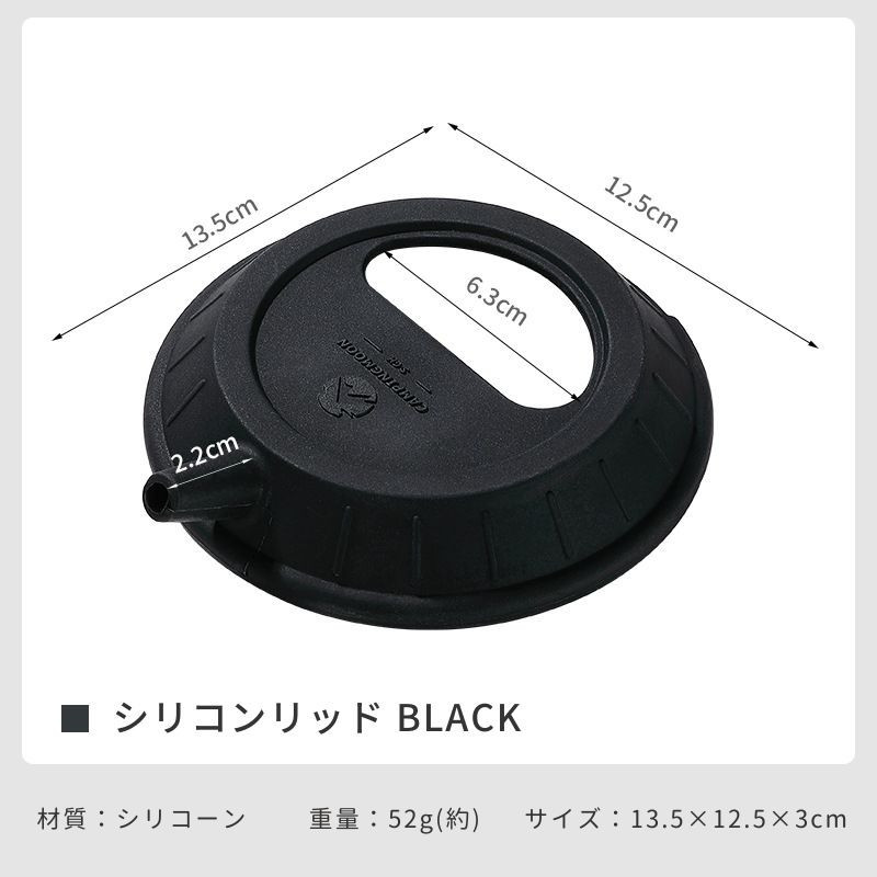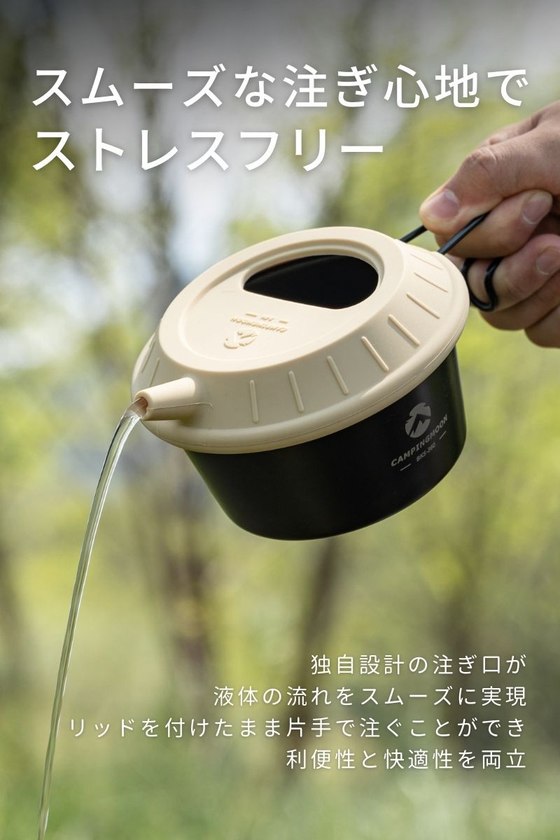 | 特徴 | シェラカップをケトルに変身させるユニークな蓋 【ホールドする構造】柔軟性と密着性に優れ、カップの縁にしっかりフィットして液体漏れを防ぎます。 【半月形の開口】便利な半円形の開口部を備えています。開口部を活用して水を加えたり茶葉を入れたりと、蓋を外さず手軽に操作が可能です。