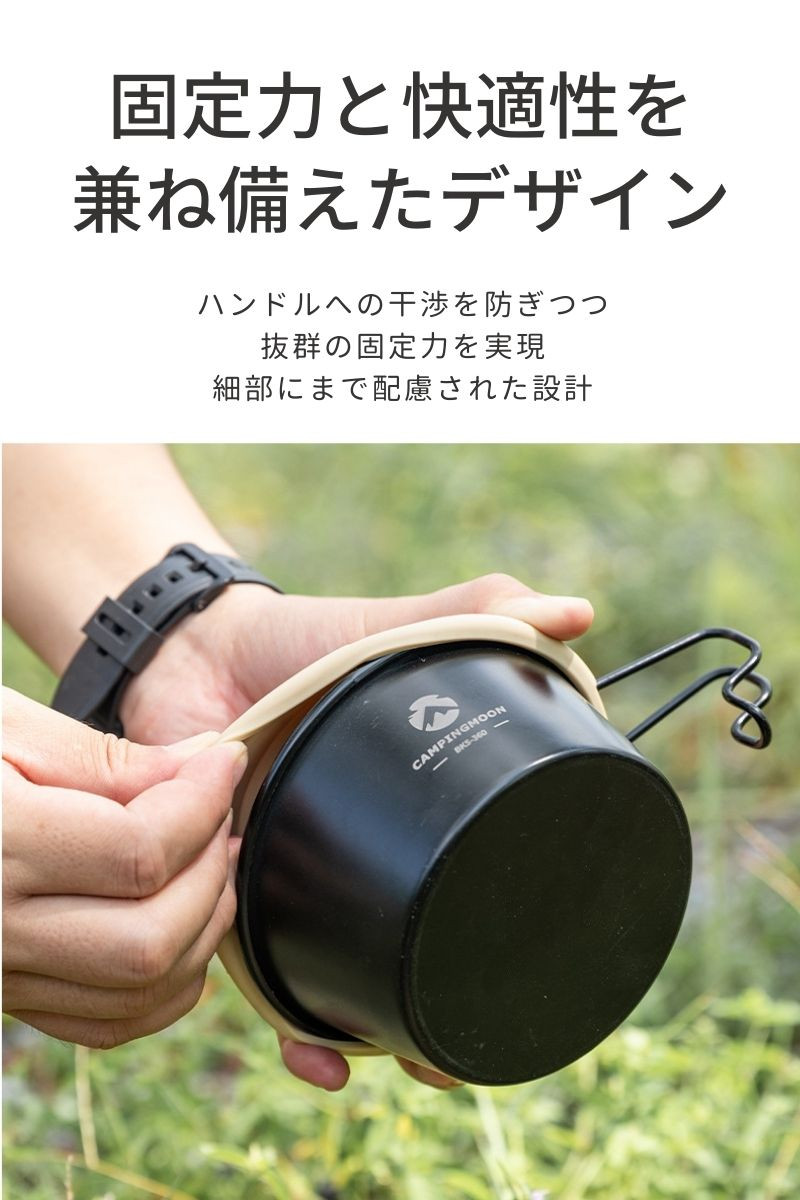 シェラカップ を確実にホールドする構造 シリコン製 ハンドル部分のデザインが工夫されており、しっかりとホールドしつつもシェラカップのハンドルに干渉しない構造を採用しています。カップの縁にしっかりフィットしてリッドを装着したままで片手で注ぐことができる