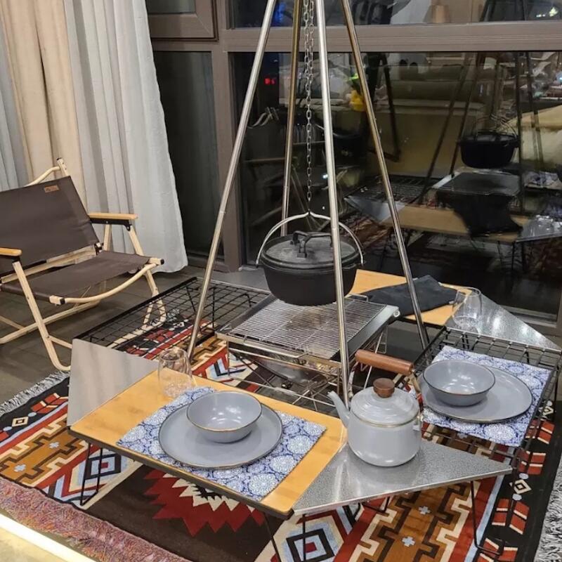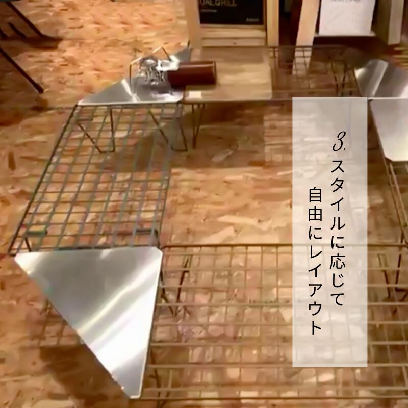 ・フィールドラック4台と本商品4枚を連結させると、囲炉裏テーブルとしてもご利用可能、スタイルに応じて自由にレイアウトできます