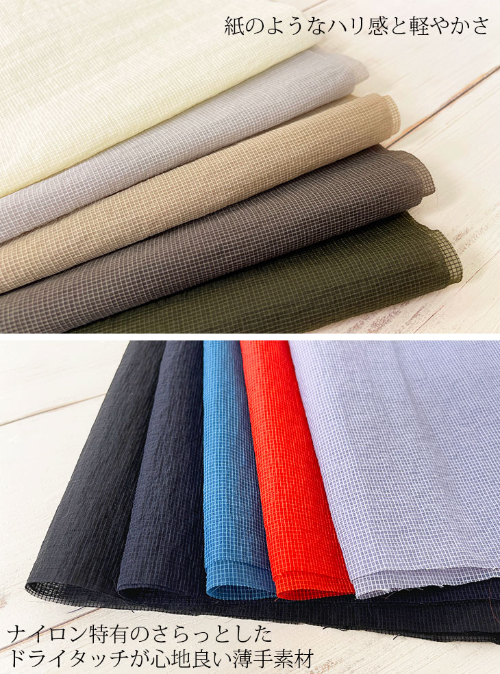 紙のようなハリ感と軽やかさ、ナイロン特有のさらっとしたドライタッチが心地よい薄手素材です。