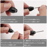 ・取り付け簡単使用の前に、ビットを取り付けます。その後、作業する部品をしっかり固定して、ドリル頭部を手に当て、垂直に力を入れて回転すると簡単穴を開けます。