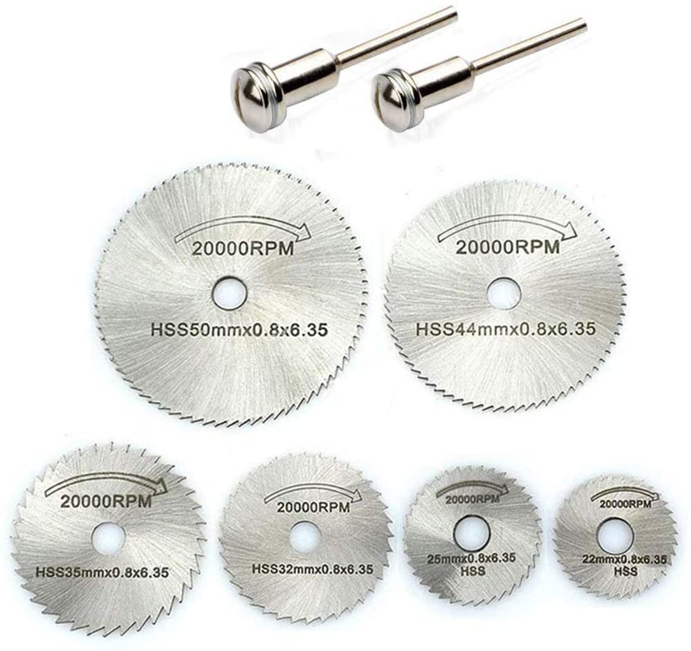 ・セット内容:丸鋸刃*6枚+3.2mmャフト*1本+6mmャフト*1本。丸鋸刃:直径 22mm 25mm 32mm 35mm 44mm 50mm。シャフト:長さ 50mm 先端直径 12mm 延長部分直径 3.2mm、6mm 丸鋸刃厚み:0.8mm。