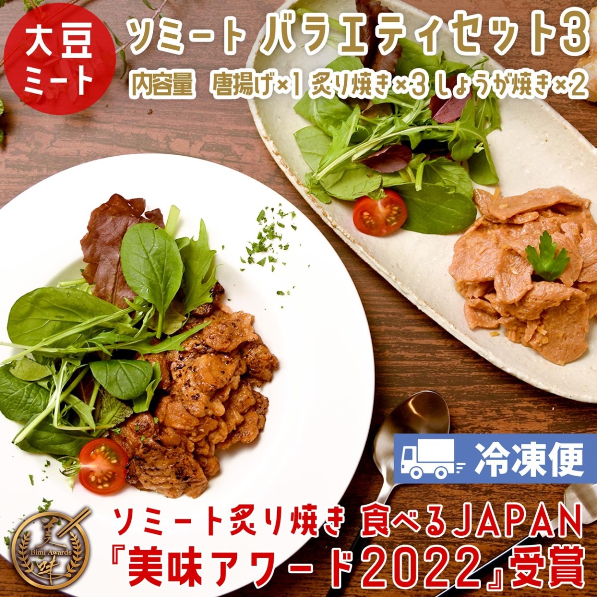 | 内容量 | (ソミート炙り焼き) : 100g × 3 (ソミートしょうが焼き):100g×2 (ソミート唐揚) :500g ×1 計1000g |