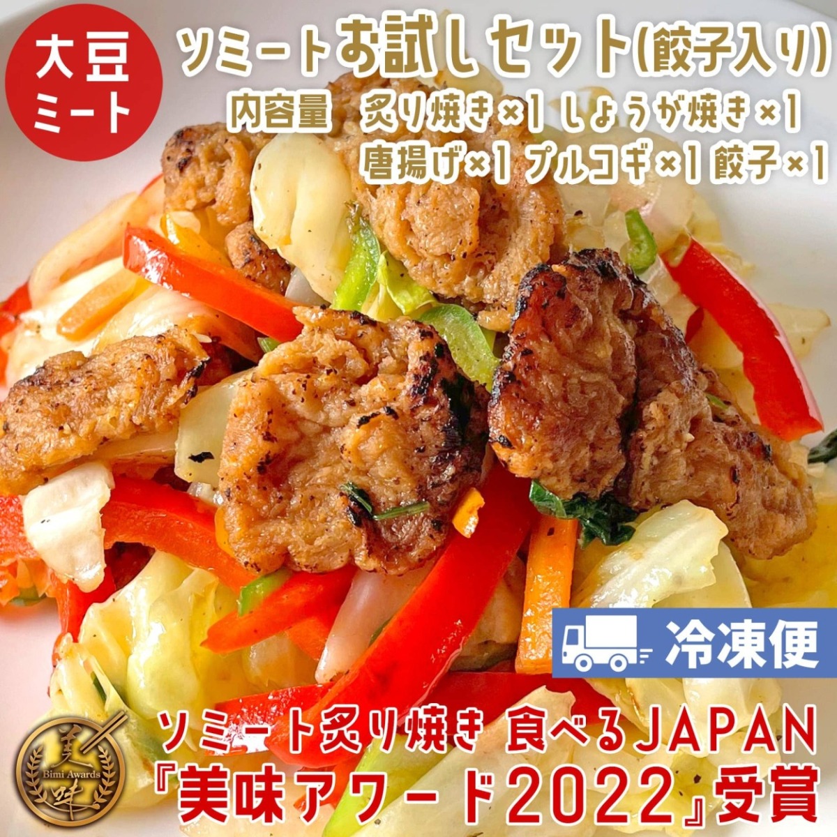 | 内容量 | (ソミート炙り焼き) : 100g ×1、 (ソミートしょうが焼き) : 100g ×1 、(ソミート唐揚) :500g ×1 、(ソミート 餃子): (18g×10個)×1 、(ソミート プルコギ): 100g×1 |