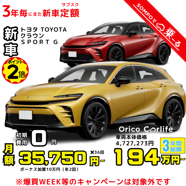 カーリース 新車 トヨタ クラウンスポーツ SPORTG 月額35,750円〜 ボーナス加算10万円(年2回)3年総額1,947,000円〜 3年毎にまた新車 ポイント2倍