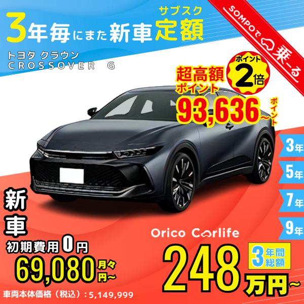 カーリース 新車 トヨタ TOYOTA クラウンクロスオーバー 月額69,080円〜 3年総額2,486,880円〜 3年毎にまた新車 ポイント2倍