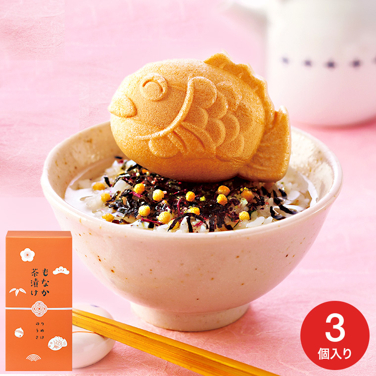 にっこり笑った鯛型もなかで、磯のかおりとあられの香ばしさが漂うのり茶漬け、しその酸味が食欲をそそるうめ茶漬け、旨味が詰まった鮭フレーク入りのさけ茶漬けを包みました。もなかの皮はモチモチ食感で食べ応え抜群。思わずほっこりするおめで鯛(たい)シーンにピッタリの贈り物です。