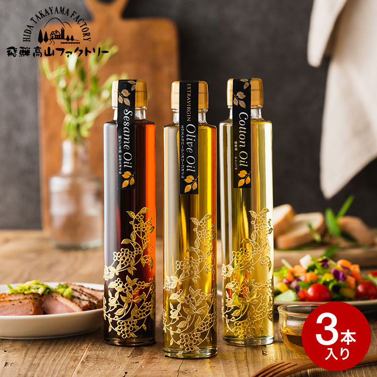 ●内容:エクストラバージンオリーブオイル165g×1 純正胡麻油165g×1 綿実油165g×1