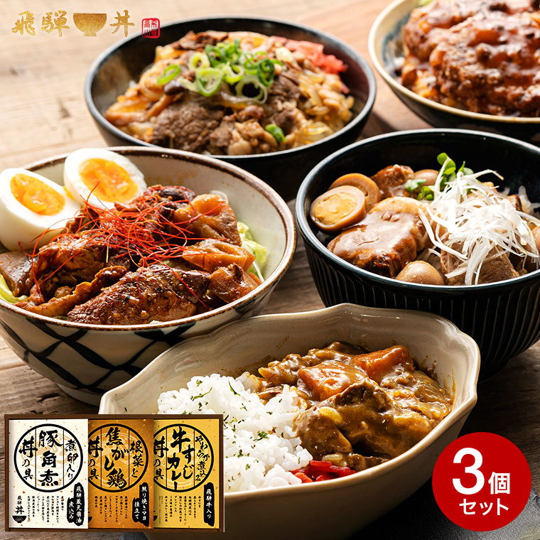 ●内容:飛騨牛仕込み牛すじカレー丼の具180g×1 照り焼きマヨ仕立て根菜と焦がし鶏丼の具160g×1 飛騨醸造蔵元醤油仕込み豚角煮丼の具170g×1
