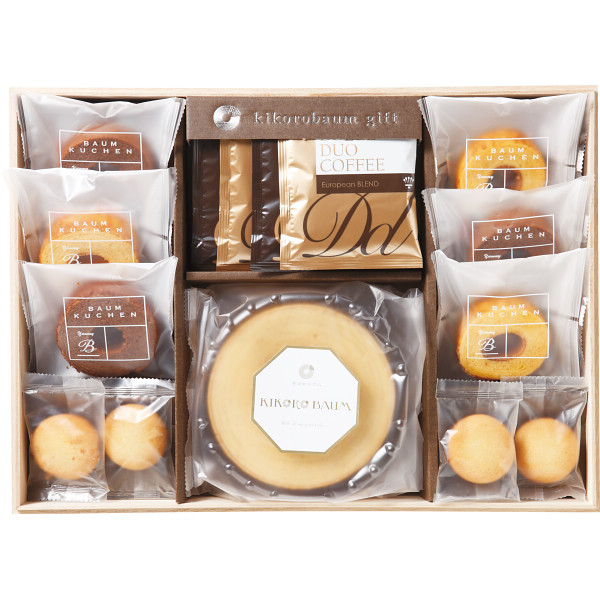 ●バウムクーヘン(北海道産生乳100%の生クリーム使用)(φ14.3cm)×1、ミニバウム(チョコ・バニラ)×各3、チョコインクッキー×4、ドリップコーヒー8g×4