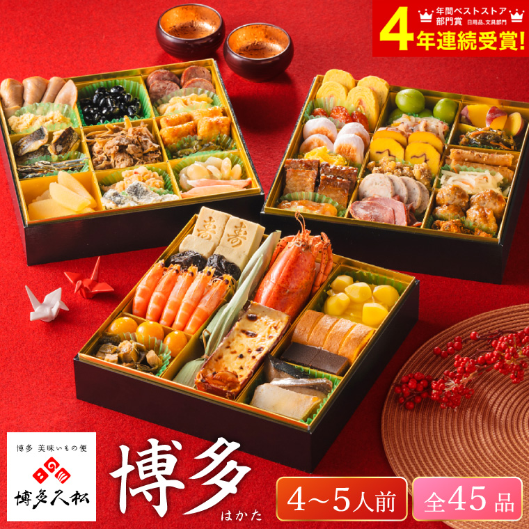 <三の重>たこマリネ/40g、いか明太和え/40g、真鱈子昆布/35g、黄金くらげ/30g、海老入り焼蒲鉾/4個、明太マヨだし巻玉子/4切、若鶏角煮/4切、タンスモーク塩レモン/40g、ボロニアソーセージハーブ/4枚、鶏つくね照焼/4個、たたき牛蒡/45g、松前漬け/45g、紅白なます/40g、伊達巻/4切、翡翠若桃/4個、やわらか干しとまと/20g、胡麻胡桃/20g、さつまいも旨煮/4切