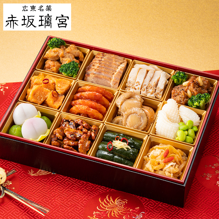 <一の重>:鶏肉の甘酢あん和え ブロッコリー添え、赤坂璃宮チャーシュー、蒸し鶏のバンバンジーソース、豚肉の黒胡椒炒め ブロッコリー・松の実添え、大西洋鮭の唐揚げ リンゴ酢風味、エビチリソース、ホタテの醤油煮、松笠いかと枝豆の中華あん、桃の花餅、若桃甘煮、クルミの飴炊き、胡瓜の甘酢漬け、クラゲの冷菜 クコの実添え