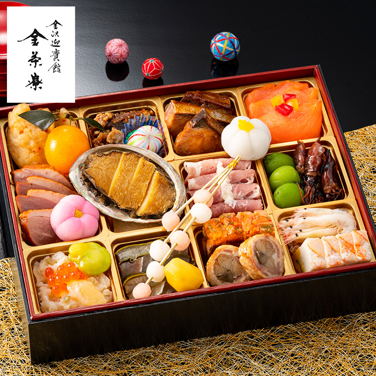 <一の重>:のどぐろ南蛮漬、葉月金柑、牛肉しぐれ煮、てまり餅、ぶり照り焼、オニオンマリネ、スモークサーモントラウト、梅の花餅 白、合鴨燻製、梅の花餅 紅、高野豆腐旨煮、あわび旨煮、アンデスポークパストラミ 塩こうじ添え、紅白餅玉串、焼ほたるいか、若桃蜜漬、数の子わさび和え、味付けいくら、そら豆、黒かじき昆布締、栗甘露煮、豚肉彩り流し、牛肉八幡巻、白エビ甘酢漬、かに真丈