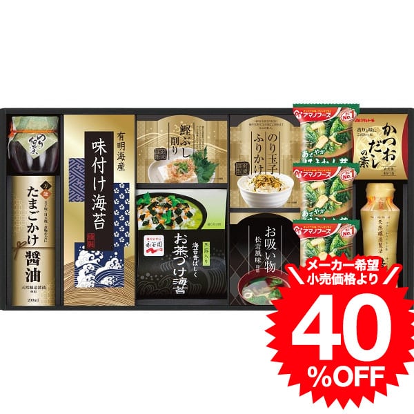 ●アマノフリーズドライほうれん草おみそ汁7g×3、島の香のり佃煮80g・有明海産味付け海苔(3切6枚)・鰹ぶし削り(2g×3)、永谷園お吸いもの松茸風味(2.3g×4)(粉末)・永谷園お茶づけ海苔(6.3g×3)・のり玉子ふりかけ(4.5g×2)・マルトモかつおだしの素(4g×4)・伊賀越たまごかけ醤油200ml・伊賀越天然醸造しょうゆ200ml×各1