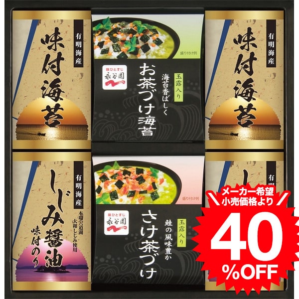 ●有明海産味付海苔(8切24枚)・しじみ醤油味付海苔(8切24枚)×各2、永谷園お茶づけ海苔(6.3g×3)・永谷園さけ茶づけ(5.6g×3)×各1
