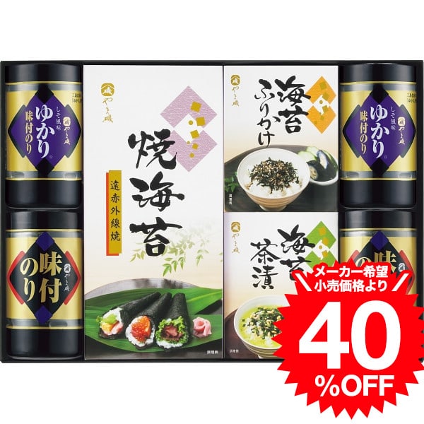 口どけのよい海苔に有機丸大豆醤油使用のたれで調味した味付海苔、三島食品の「ゆかり」を使用したたれで調味した赤しそ風味の味付海苔、遠赤外線でパリッと焼き上げた風味豊かな焼海苔、味付海苔と香ばしいごまの風味がおいしい海苔ふりかけ、焼海苔にごまやあられをブレンドした後味さわやかなお茶漬けをセットしたバラエティギフトです。
