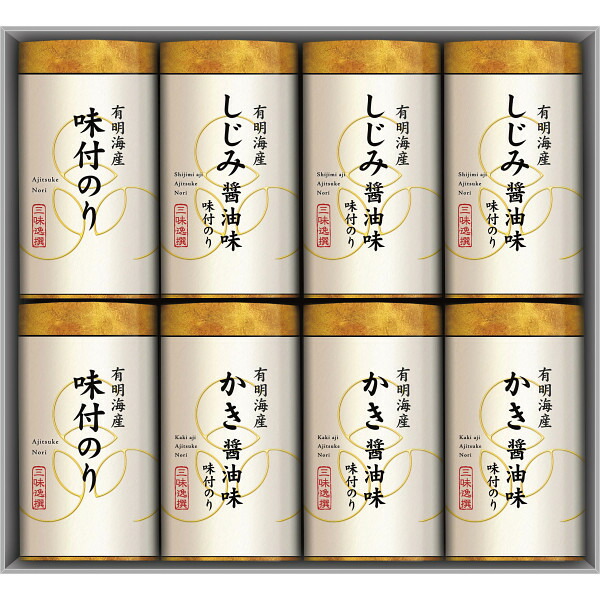味付海苔食べ比べ。芳醇な醤油の香の有明海産味付海苔、ギュッと詰まった牡蠣の濃厚な旨味の牡蠣醤油味、しじみだしがきいた深い味わいのしじみ醤油味を詰合せました。