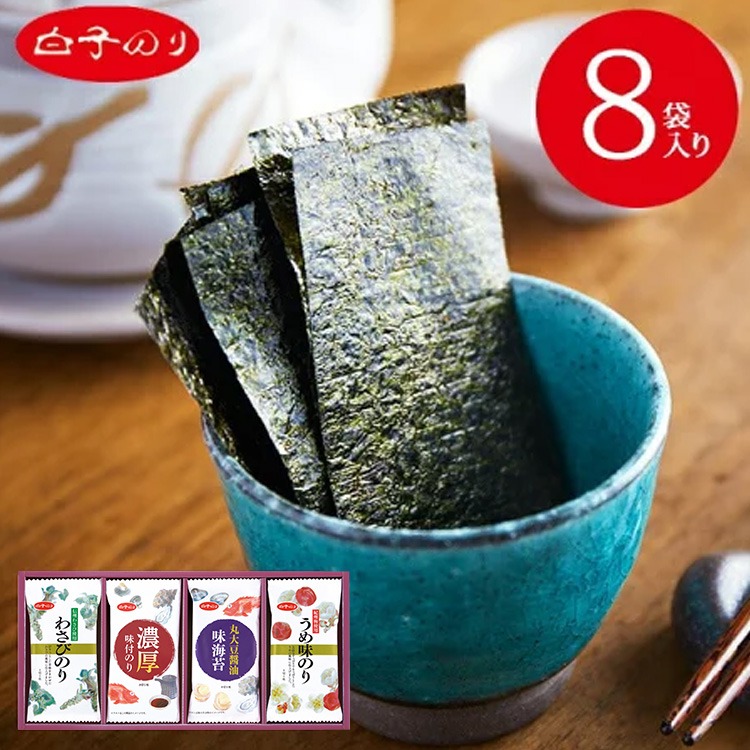 ●内容 : 信州わさび使用わさびのり(8切5枚)×2袋、濃厚味海苔(8切5枚)×2袋、丸大豆醤油味のり(8切5枚)×2袋、紀州梅使用うめ味のり(8切5枚)×2袋